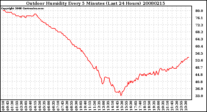 Milwaukee Weather -- 20080215 Outdoor Humidity Every 5 Minutes (Last 24 Hours) -- From curtronics.com by Curt Blank