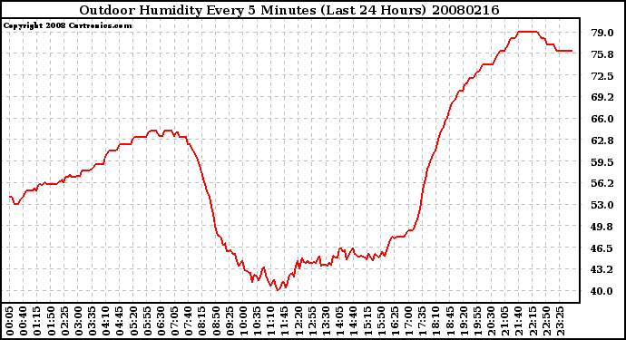 Milwaukee Weather -- 20080216 Outdoor Humidity Every 5 Minutes (Last 24 Hours) -- From curtronics.com by Curt Blank