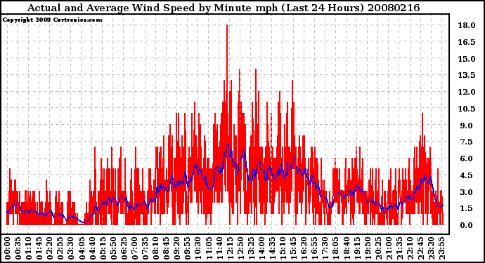 Milwaukee Weather -- 20080216 Actual and Average Wind Speed by Minute mph (Last 24 Hours) -- From curtronics.com by Curt Blank