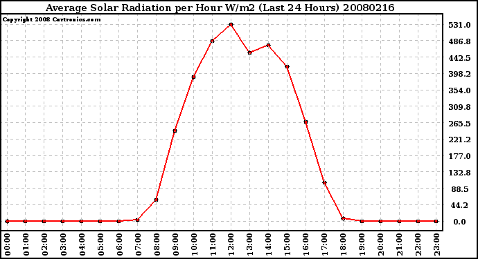 Milwaukee Weather -- 20080216 Average Solar Radiation per Hour W/m2 (Last 24 Hours) -- From curtronics.com by Curt Blank