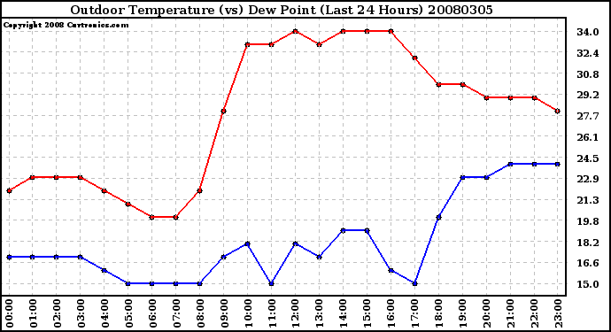 Milwaukee Weather -- 20080305 Outdoor Temperature (vs) Dew Point (Last 24 Hours) -- From curtronics.com by Curt Blank