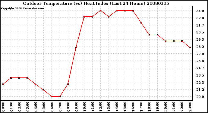 20080305 Outdoor Temperature (vs) Heat Index (Last 24 Hours)