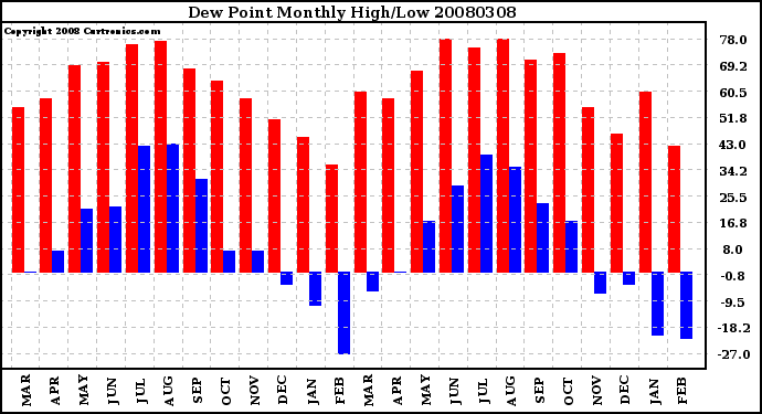 Milwaukee Weather -- 20080308 Dew Point Monthly High/Low -- From curtronics.com by Curt Blank