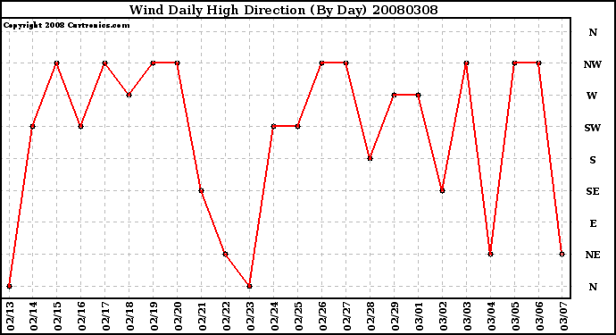Milwaukee Weather -- 20080308 Wind Daily High Direction (By Day) -- From curtronics.com by Curt Blank