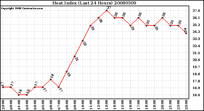 Milwaukee Weather -- 20080309 Heat Index (Last 24 Hours) -- From curtronics.com by Curt Blank