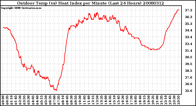 Milwaukee Weather -- 20080312 Outdoor Temp (vs) Heat Index per Minute (Last 24 Hours) -- From curtronics.com by Curt Blank