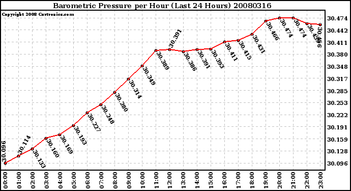 Milwaukee Weather -- 20080316 Barometric Pressure per Hour (Last 24 Hours) -- From curtronics.com by Curt Blank