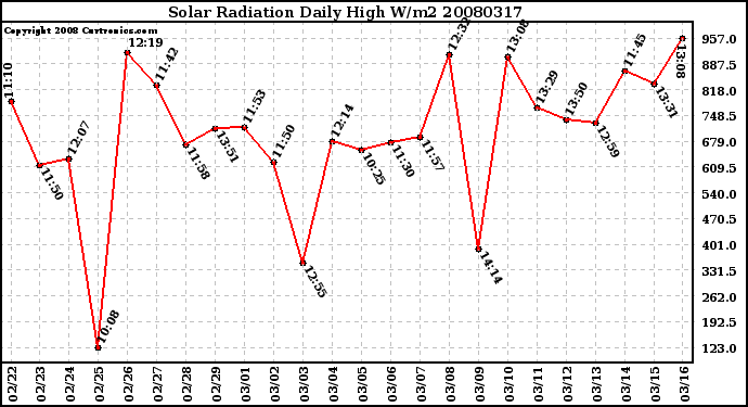 Milwaukee Weather -- 20080317 Solar Radiation Daily High W/m2 -- From curtronics.com by Curt Blank