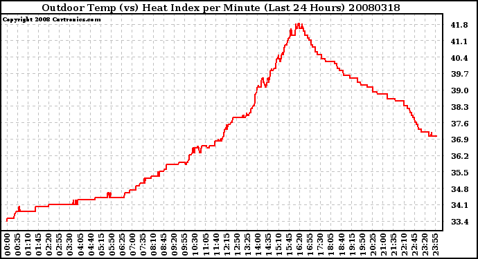 Milwaukee Weather -- 20080318 Outdoor Temp (vs) Heat Index per Minute (Last 24 Hours) -- From curtronics.com by Curt Blank