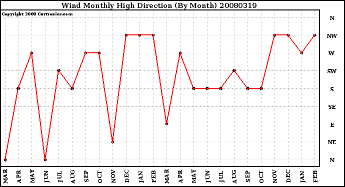 Milwaukee Weather -- 20080319 Wind Monthly High Direction (By Month) -- From curtronics.com by Curt Blank