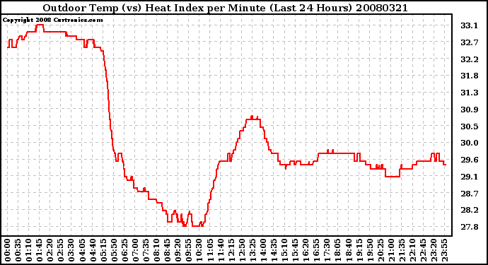 Milwaukee Weather -- 20080321 Outdoor Temp (vs) Heat Index per Minute (Last 24 Hours) -- From curtronics.com by Curt Blank