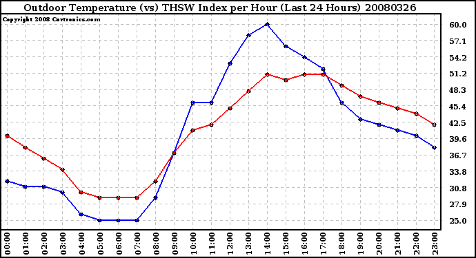 Milwaukee Weather -- 20080326 Outdoor Temperature (vs) THSW Index per Hour (Last 24 Hours) -- From curtronics.com by Curt Blank