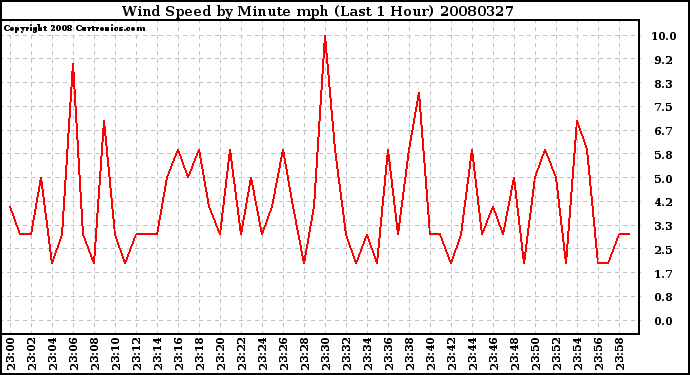 Milwaukee Weather -- 20080327 Wind Speed by Minute mph (Last 1 Hour) -- From curtronics.com by Curt Blank