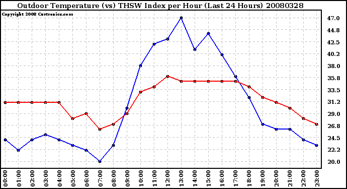 Milwaukee Weather -- 20080328 Outdoor Temperature (vs) THSW Index per Hour (Last 24 Hours) -- From curtronics.com by Curt Blank