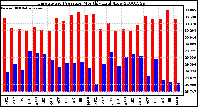Milwaukee Weather -- 20080329 Barometric Pressure Monthly High/Low -- From curtronics.com by Curt Blank