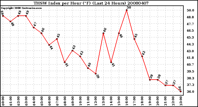 Milwaukee Weather -- 20080407 THSW Index per Hour (°F) (Last 24 Hours) -- From curtronics.com by Curt Blank