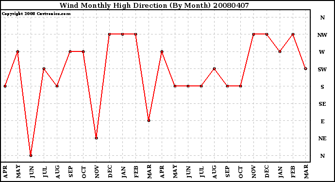 Milwaukee Weather -- 20080407 Wind Monthly High Direction (By Month) -- From curtronics.com by Curt Blank