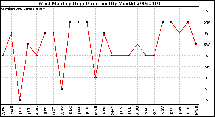 Milwaukee Weather -- 20080410 Wind Monthly High Direction (By Month) -- From curtronics.com by Curt Blank