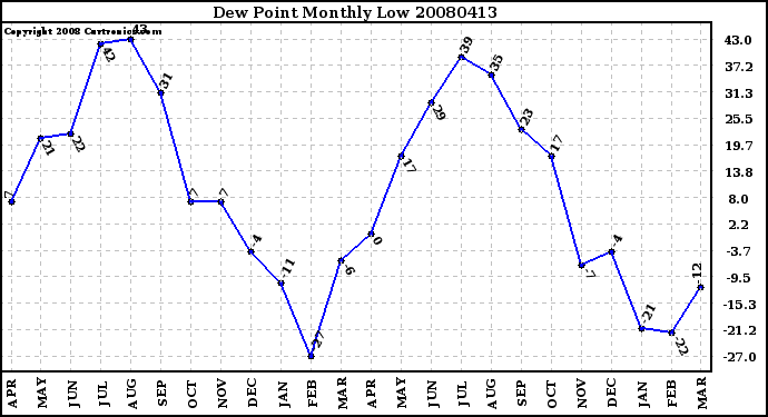 Milwaukee Weather -- 20080413 Dew Point Monthly Low -- From curtronics.com by Curt Blank