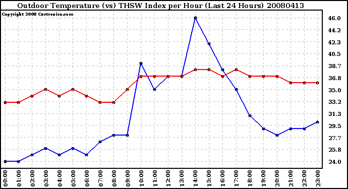 Milwaukee Weather -- 20080413 Outdoor Temperature (vs) THSW Index per Hour (Last 24 Hours) -- From curtronics.com by Curt Blank