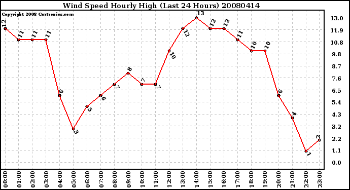 20080414 Wind Speed Hourly High (Last 24 Hours)