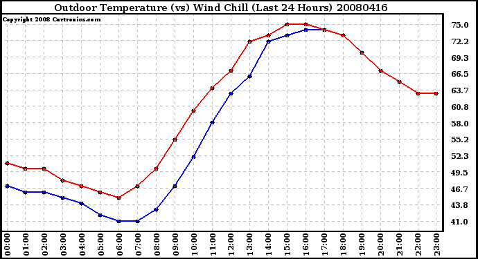 Milwaukee Weather -- 20080416 Outdoor Temperature (vs) Wind Chill (Last 24 Hours) -- From curtronics.com by Curt Blank