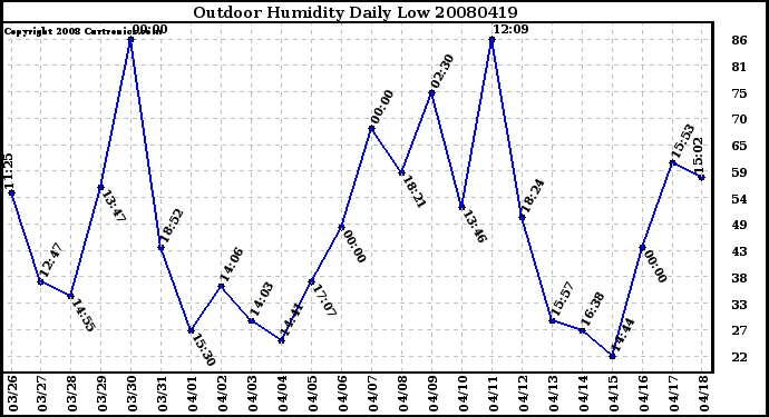 Milwaukee Weather -- 20080419 Outdoor Humidity Daily Low -- From curtronics.com by Curt Blank