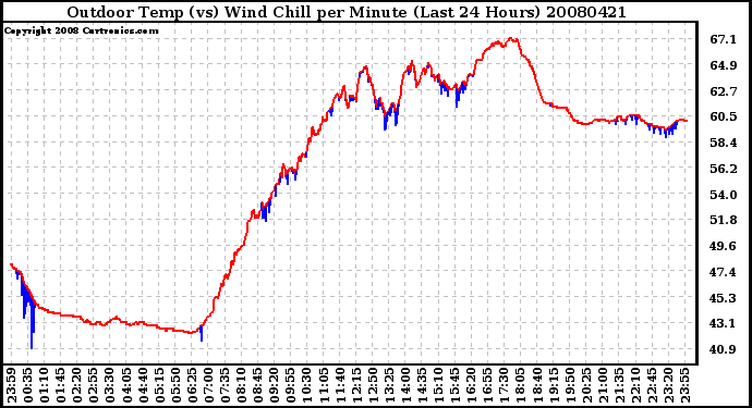 Milwaukee Weather -- 20080421 Outdoor Temp (vs) Wind Chill per Minute (Last 24 Hours) -- From curtronics.com by Curt Blank