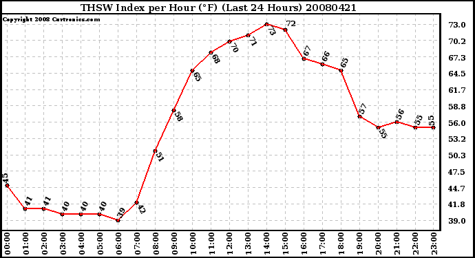 Milwaukee Weather -- 20080421 THSW Index per Hour (°F) (Last 24 Hours) -- From curtronics.com by Curt Blank