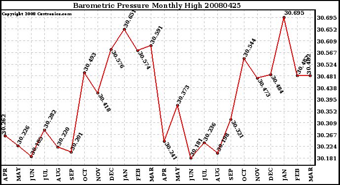 Milwaukee Weather -- 20080425 Barometric Pressure Monthly High -- From curtronics.com by Curt Blank