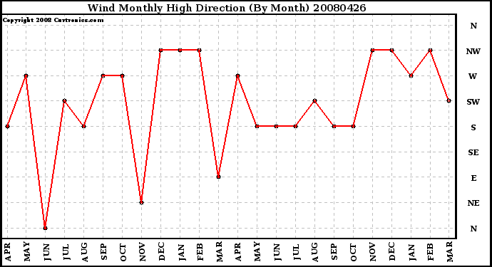 Milwaukee Weather -- 20080426 Wind Monthly High Direction (By Month) -- From curtronics.com by Curt Blank