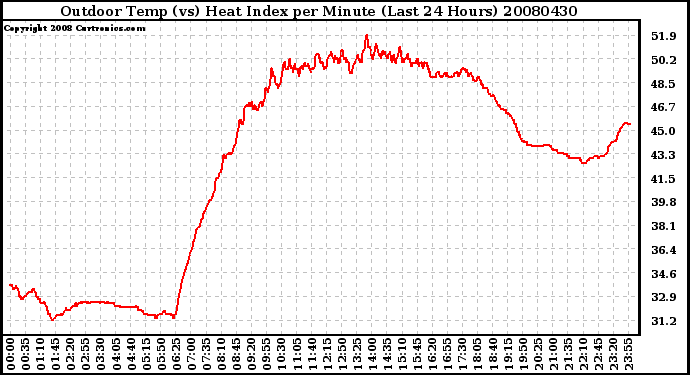 Milwaukee Weather -- 20080430 Outdoor Temp (vs) Heat Index per Minute (Last 24 Hours) -- From curtronics.com by Curt Blank