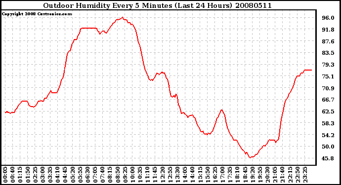 Milwaukee Weather -- 20080511 Outdoor Humidity Every 5 Minutes (Last 24 Hours) -- From curtronics.com by Curt Blank