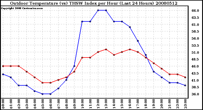 Milwaukee Weather -- 20080512 Outdoor Temperature (vs) THSW Index per Hour (Last 24 Hours) -- From curtronics.com by Curt Blank