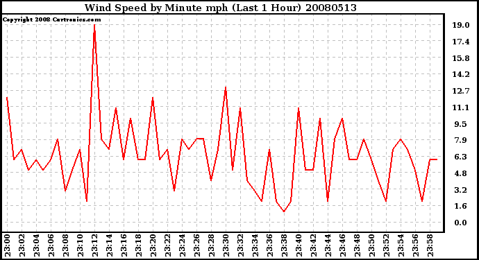 Milwaukee Weather -- 20080513 Wind Speed by Minute mph (Last 1 Hour) -- From curtronics.com by Curt Blank