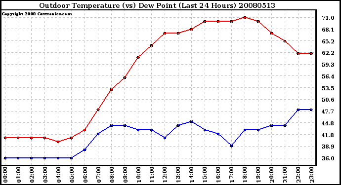 Milwaukee Weather -- 20080513 Outdoor Temperature (vs) Dew Point (Last 24 Hours) -- From curtronics.com by Curt Blank