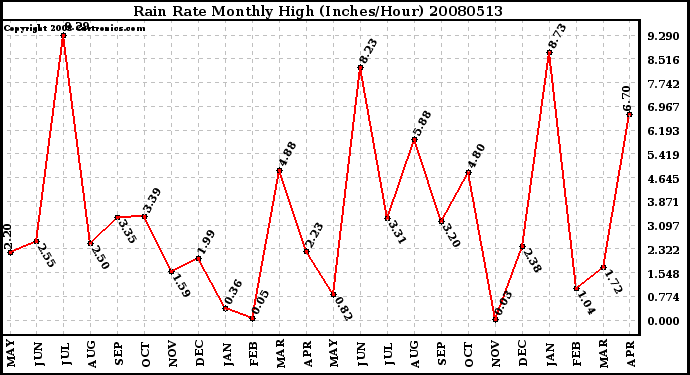 Milwaukee Weather -- 20080513 Rain Rate Monthly High (Inches/Hour) -- From curtronics.com by Curt Blank