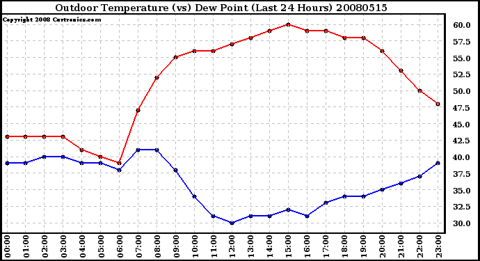 Milwaukee Weather -- 20080515 Outdoor Temperature (vs) Dew Point (Last 24 Hours) -- From curtronics.com by Curt Blank