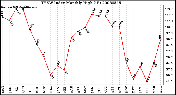 Milwaukee Weather -- 20080515 THSW Index Monthly High (°F) -- From curtronics.com by Curt Blank