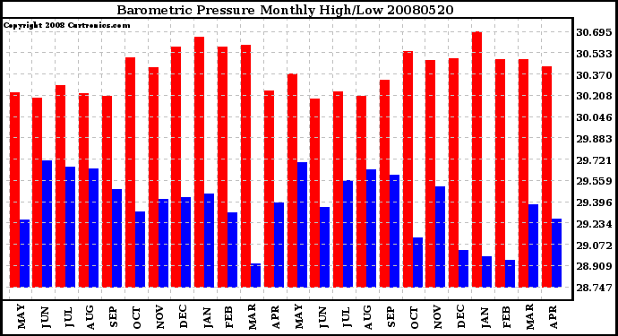 Milwaukee Weather -- 20080520 Barometric Pressure Monthly High/Low -- From curtronics.com by Curt Blank