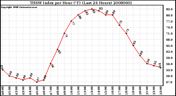 Milwaukee Weather -- 20080601 THSW Index per Hour (°F) (Last 24 Hours) -- From curtronics.com by Curt Blank