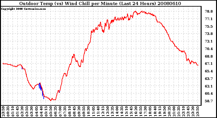 Milwaukee Weather -- 20080610 Outdoor Temp (vs) Wind Chill per Minute (Last 24 Hours) -- From curtronics.com by Curt Blank