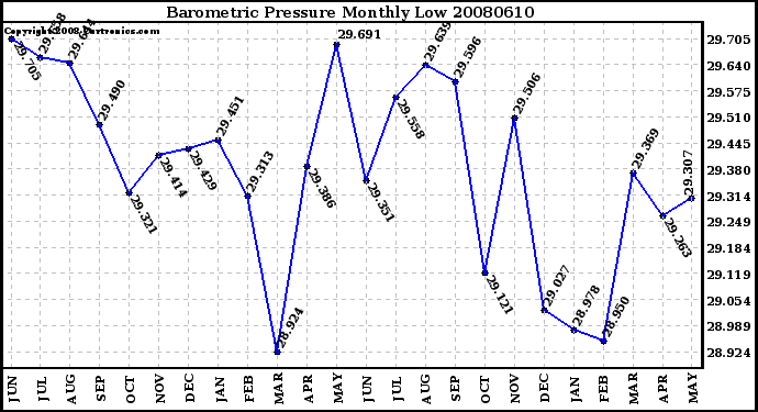 Milwaukee Weather -- 20080610 Barometric Pressure Monthly Low -- From curtronics.com by Curt Blank