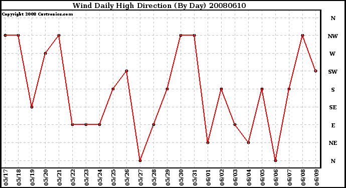 Milwaukee Weather -- 20080610 Wind Daily High Direction (By Day) -- From curtronics.com by Curt Blank