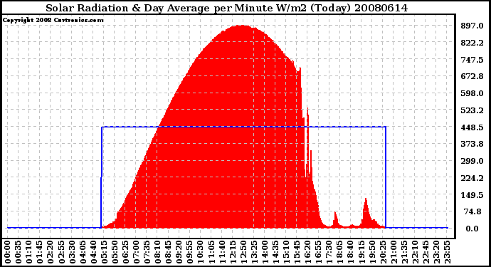 Milwaukee Weather -- 20080614 Solar Radiation & Day Average per Minute W/m2 (Today) -- From curtronics.com by Curt Blank