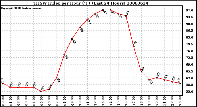 Milwaukee Weather -- 20080614 THSW Index per Hour (°F) (Last 24 Hours) -- From curtronics.com by Curt Blank