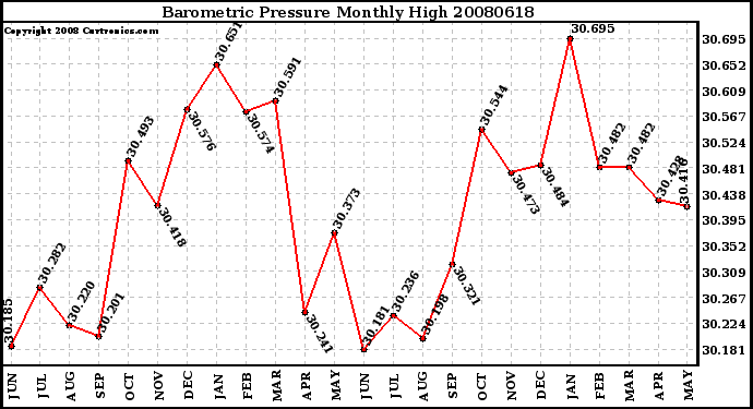 Milwaukee Weather -- 20080618 Barometric Pressure Monthly High -- From curtronics.com by Curt Blank