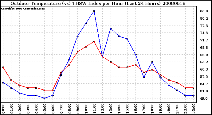 Milwaukee Weather -- 20080618 Outdoor Temperature (vs) THSW Index per Hour (Last 24 Hours) -- From curtronics.com by Curt Blank
