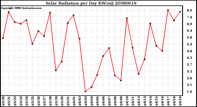 Milwaukee Weather -- 20080619 Solar Radiation per Day KW/m2 -- From curtronics.com by Curt Blank