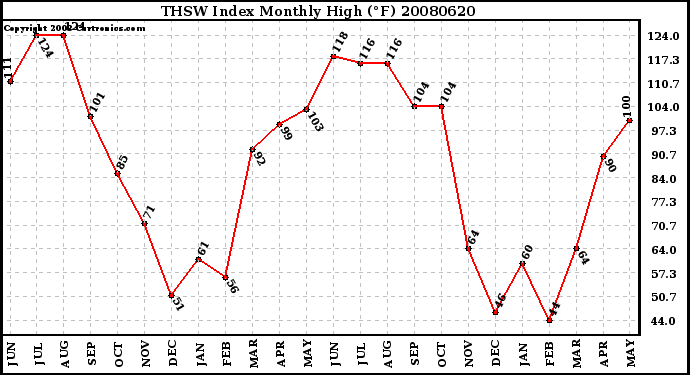 Milwaukee Weather -- 20080620 THSW Index Monthly High (°F) -- From curtronics.com by Curt Blank